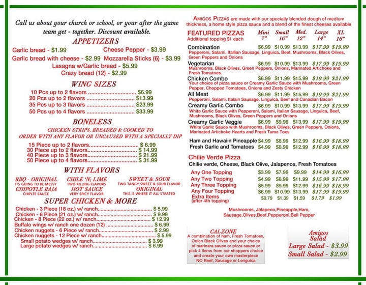 Amigo's Pizza, located in Bakersfield, CA, offers a wide range of delicious options including appetizers like garlic bread and mozzarella sticks, fresh salads, and mouth-watering pizzas such as the Combination Pizza and Vegetarian Pizza. With a focus on quality ingredients and exceptional flavors, customers rave about the extreme gourmet experience and excellent service. Whether you're in the mood for a classic pepperoni pizza or a unique Hawaiian with jalapenos, Amigo's Pizza delivers consistent, flavorful creations that will keep you coming back for more. Don't miss out on their crispy wings and perfect wedges for the ultimate pizza feast.