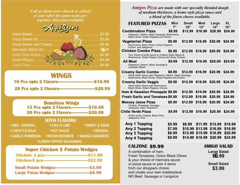 “ First time here , we planned on going to Vallarta market but thought we'd better fill our bellies first . Amigo's pizza is right next door so this was perfect !! Ordered the combination pizza , boneless and regular wings and wedges Nd an ice cold pitcher of Modelo beer . Oh my goodness the first bite was a burst of freshness and full of flavor !! Fresh mushrooms, fresh green peppers and purple onions , I ate slowly so I could savor each bite because I knew I'd get full fast . I noticed they have Indian pizza as well I can't wait to come back and try it . This place is a hidden gem , great friendly customer service and social distancing is not a problem here . ”